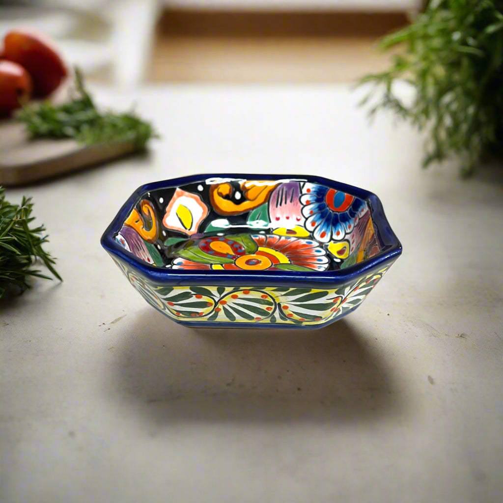 Featuring a bold and festive floral pattern, this square ceramic bowl highlights rich hues like orange, blue, red, and green. Each side is beautifully hand-painted with traditional Talavera flair, adding personality to your kitchen or tabletop.
