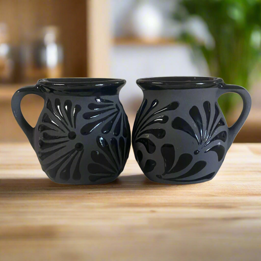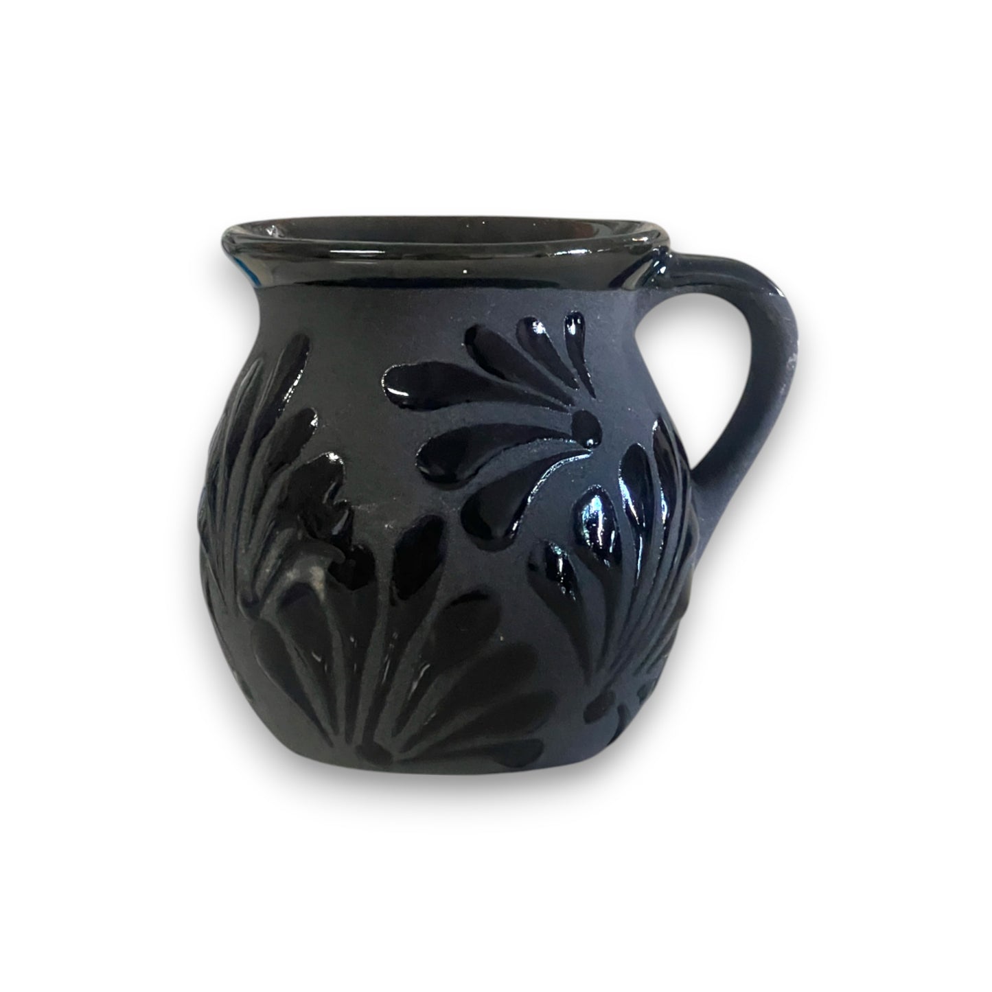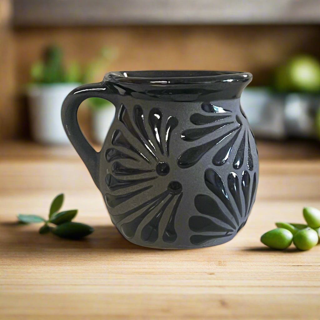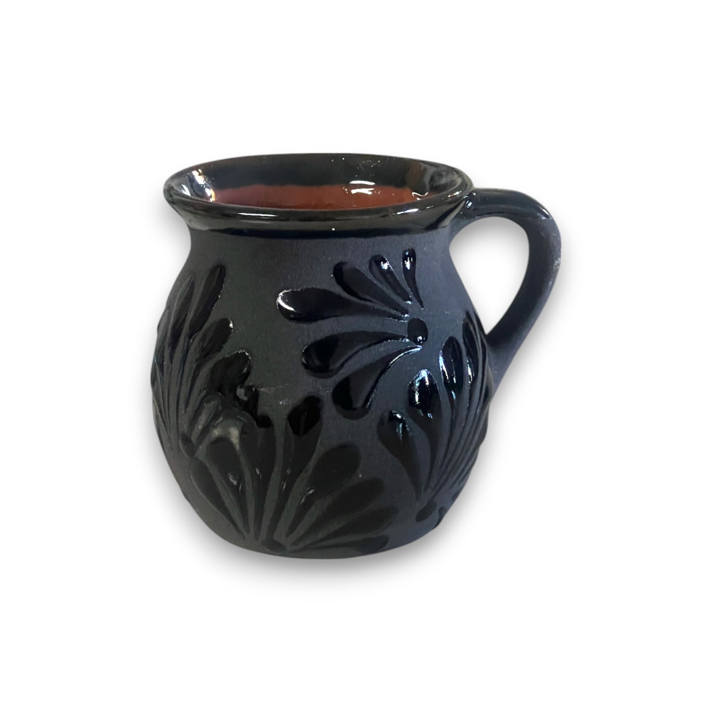 Traditional jarrito shape with a rounded body, curved handle, and detailed floral carvings. Finished in a rich black glaze for an elegant, minimal look.