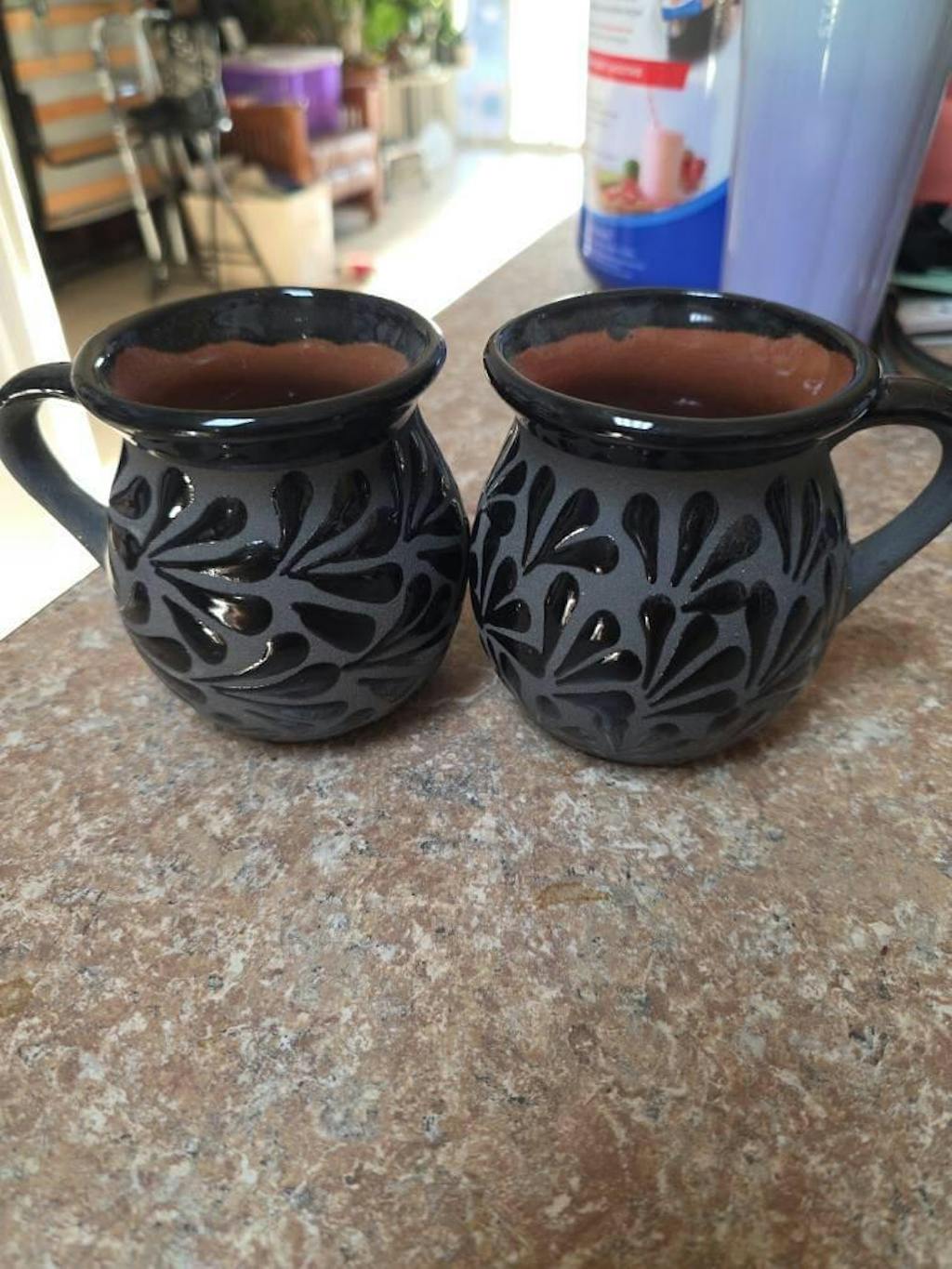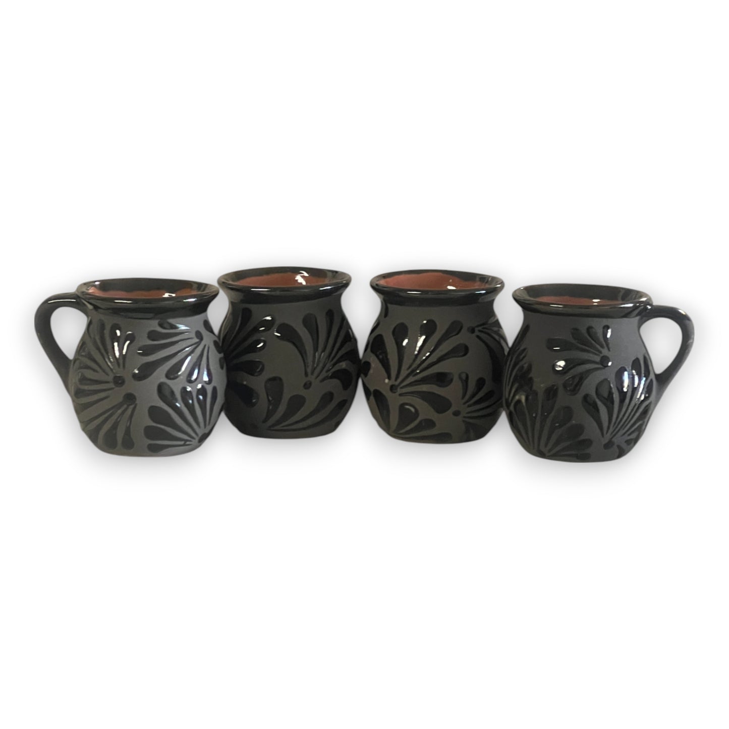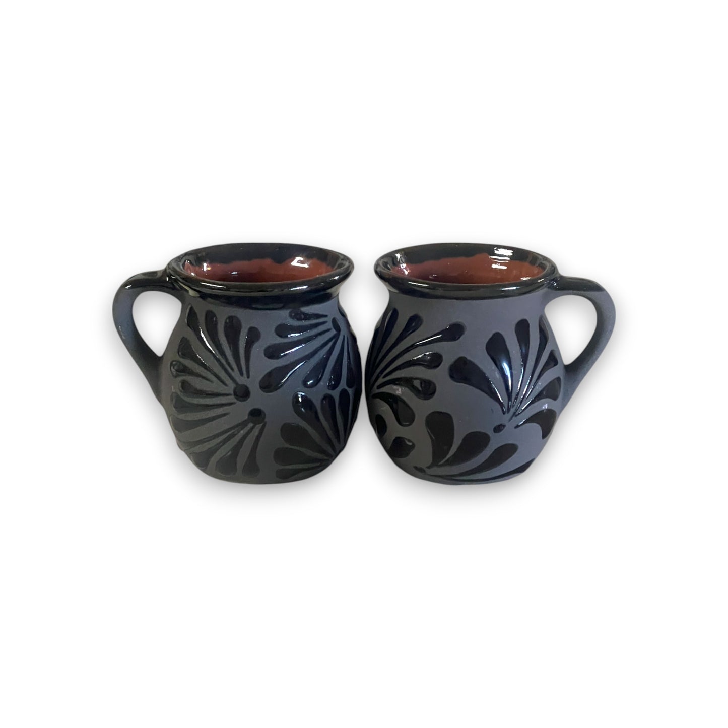 Traditional jarrito shape with a rounded body, curved handle, and detailed floral carvings. Finished in a rich black glaze for an elegant, minimal look.