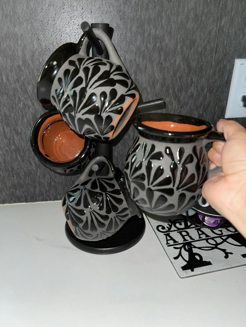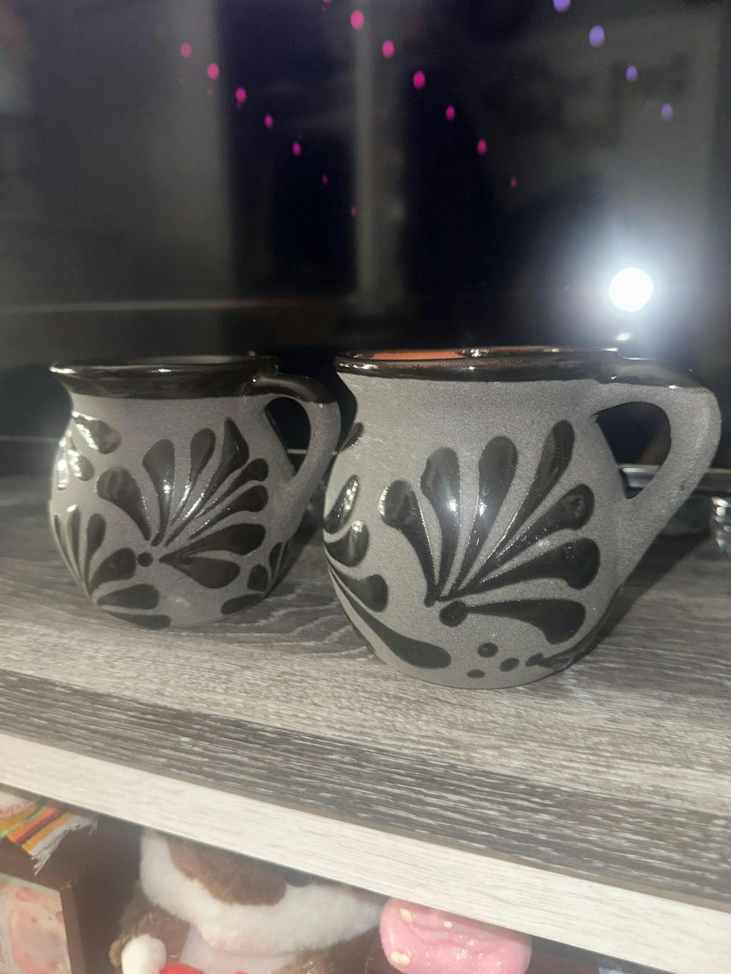 Designed by The Talavera Hub and crafted by hand at our family partner workshop in Guanajuato, Mexico. This piece is hand-painted and kiln-fired with a lead-free glaze. Its bold black glaze and hand-carved floral pattern give it a timeless, rustic charm—perfect for your morning cafecito or evening tea.