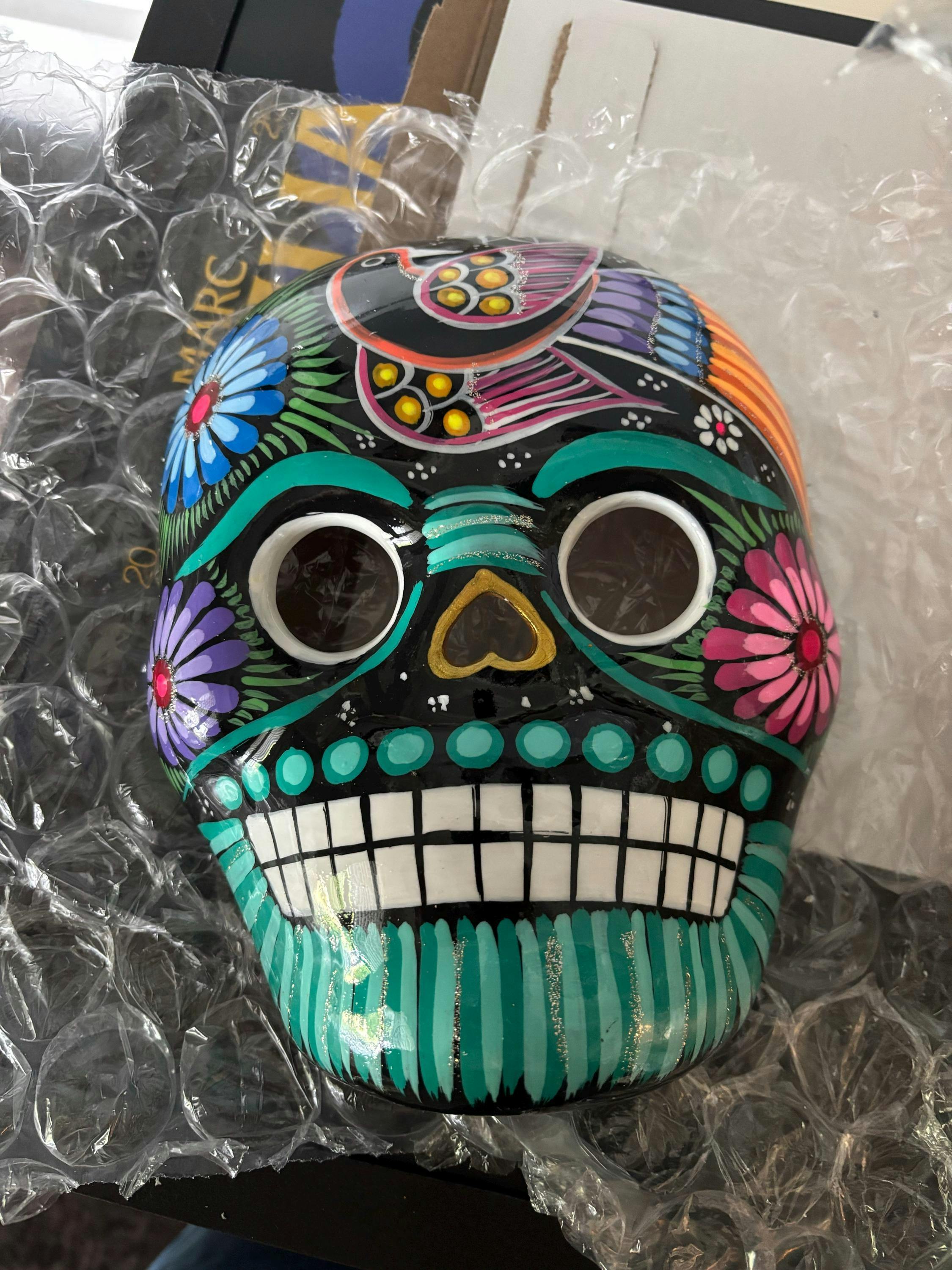 This wall-hanging skull features a radiant palette of reds, greens, yellows, and purples with intricate linework and floral designs. Its bold expression and lively colors embody Mexican folk art and holiday spirit.