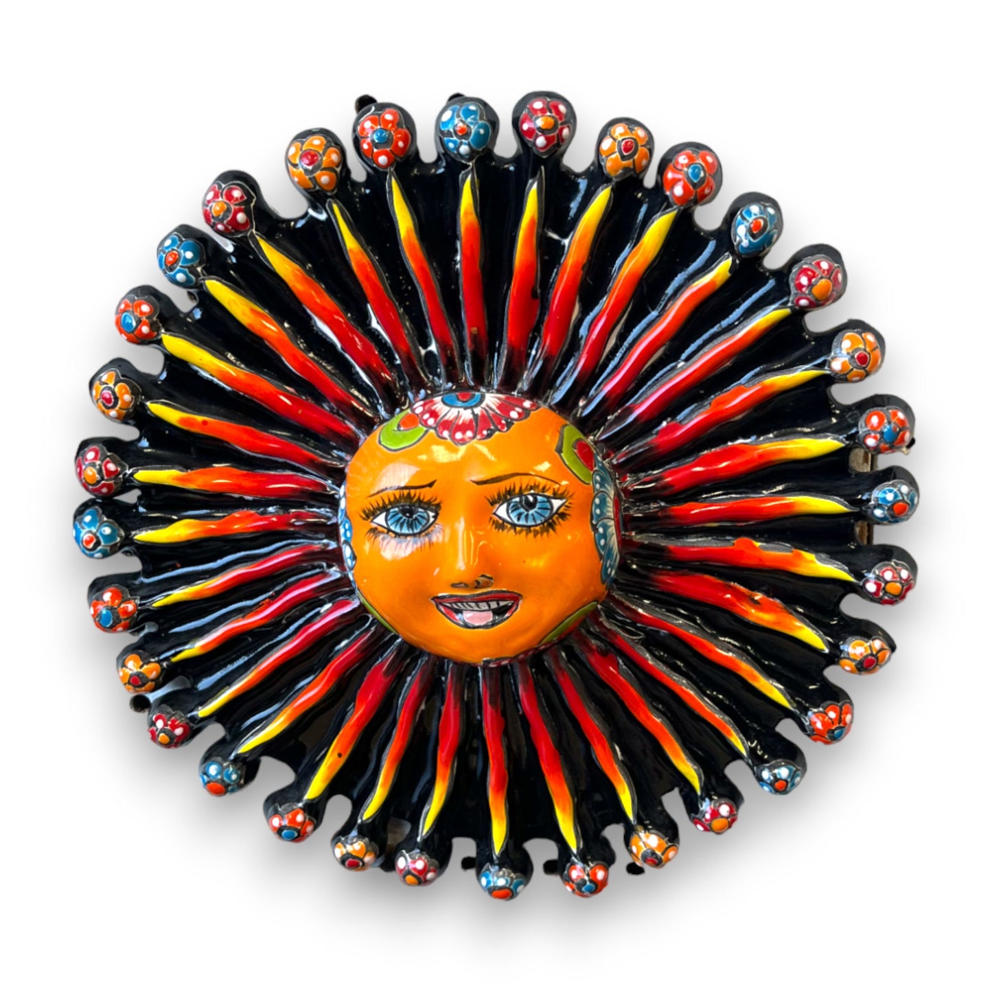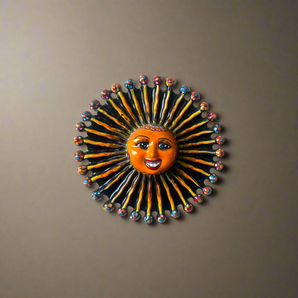 Bright orange face surrounded by black, red, and yellow sunrays. Features hand-painted floral accents and expressive facial details. Designed to hang easily on any wall.