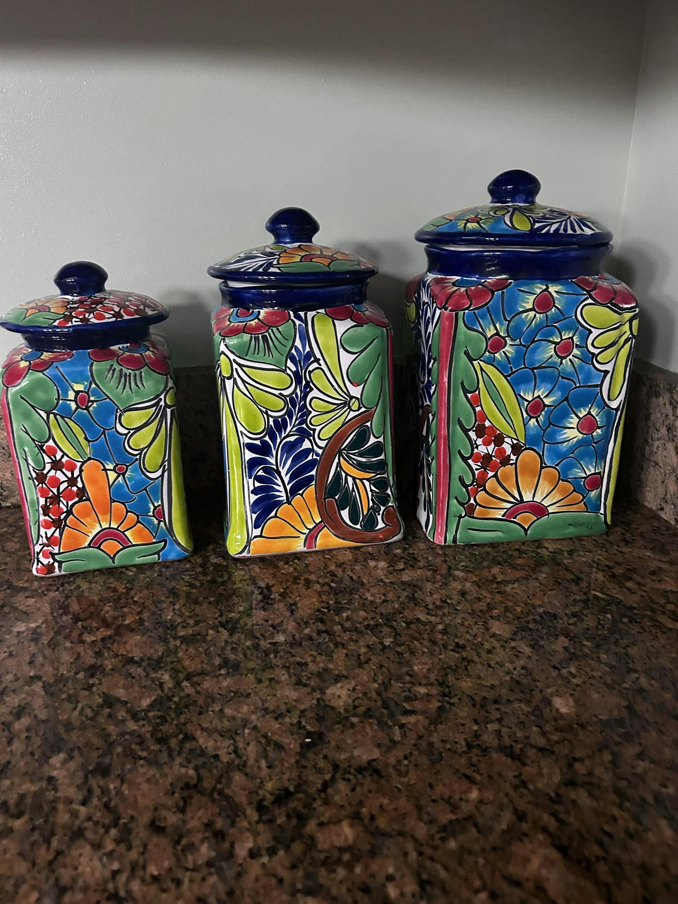 This 3-piece set features square-bodied canisters with domed lids, each finished with a classic blue rim. The rest of the jar showcases vibrant hand-painted Talavera designs in various floral and geometric patterns. These are multicolor canisters—expect lots of bright tones like red, orange, green, blue, and yellow. Each set is unique and patterns will vary.