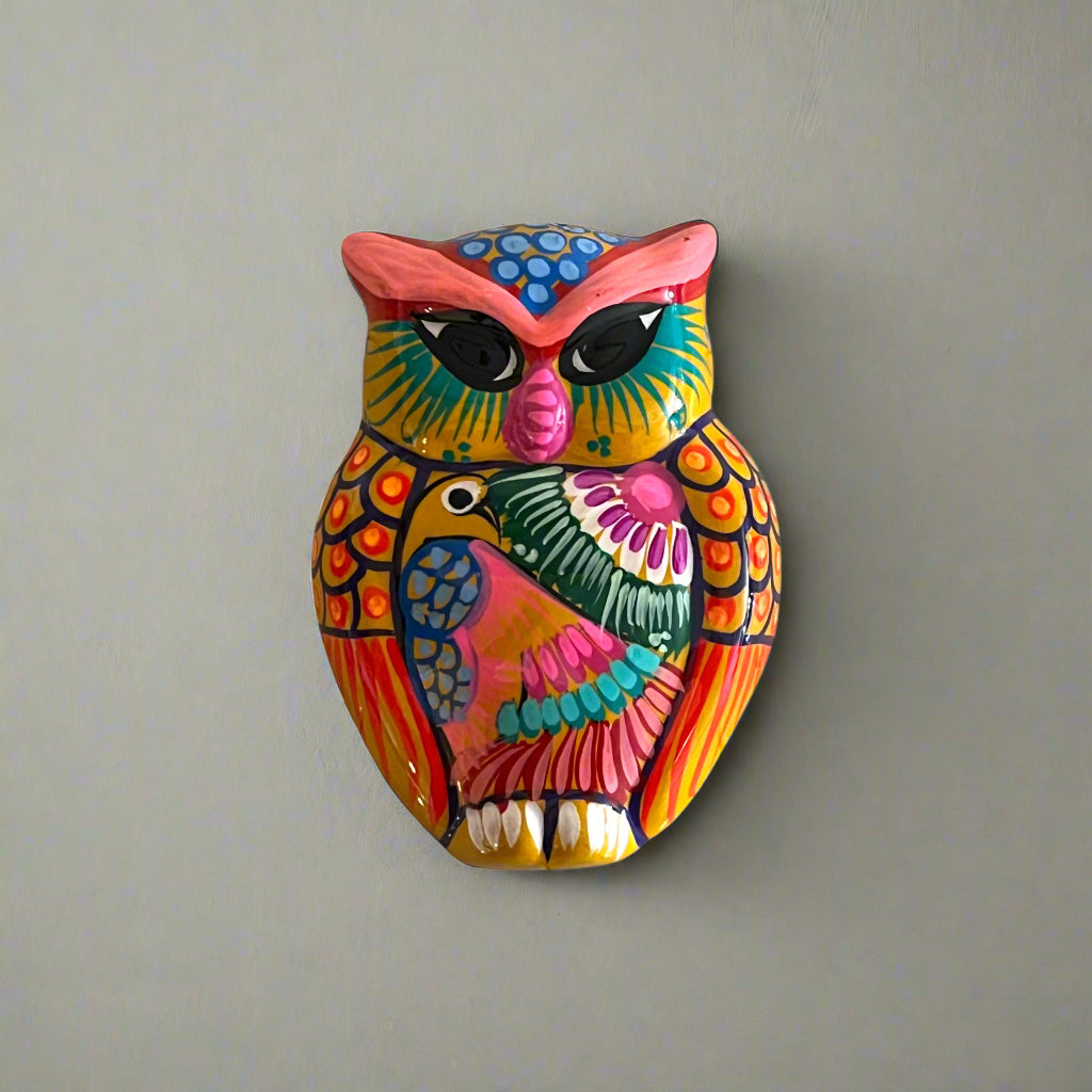 This playful owl bursts with vivid color, featuring hand-painted florals, birds, and bold patterns in warm orange tones. Its quirky expression and layered brushstrokes make it a lively focal point for kitchens, hallways, or covered outdoor walls.