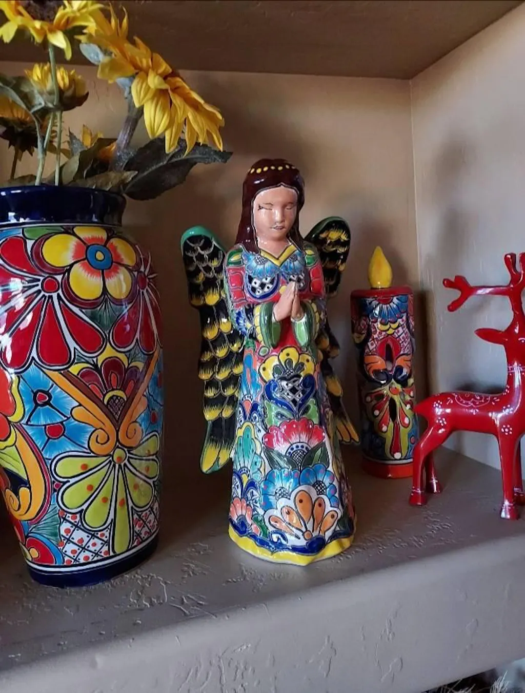 This angel features vivid hand-painted floral and geometric patterns in bold Talavera colors like yellow, red, green, and blue. With folded hands and intricately detailed wings, it makes a heartfelt decorative piece.