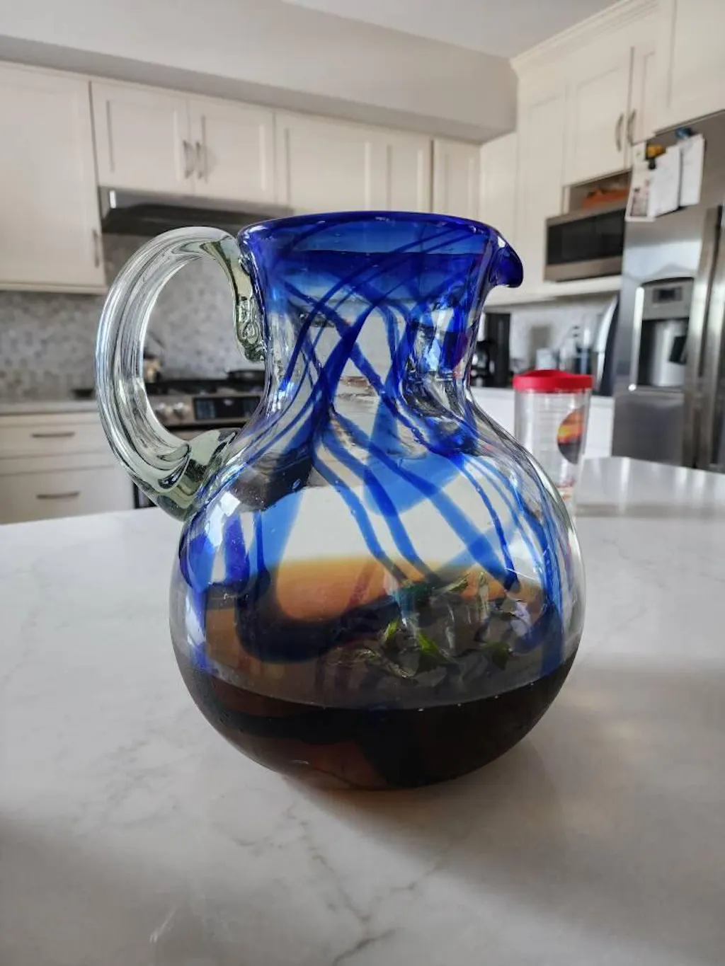 Serve drinks with elegance and color using this hand-blown Mexican glass pitcher. Designed by The Talavera Hub and crafted by hand at our family partner workshop in Guanajuato, Mexico. This pitcher is hand-blown and made with lead-free glass. Crafted by skilled artisans, this eye-catching piece features a vibrant blue swirl design that brings handmade charm to your kitchen or dining space.