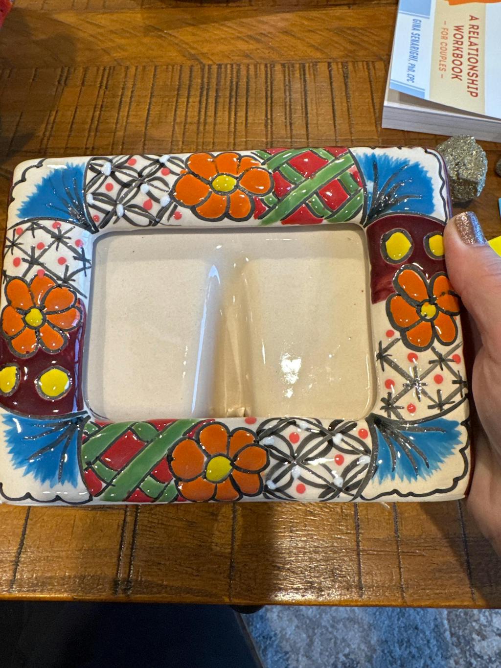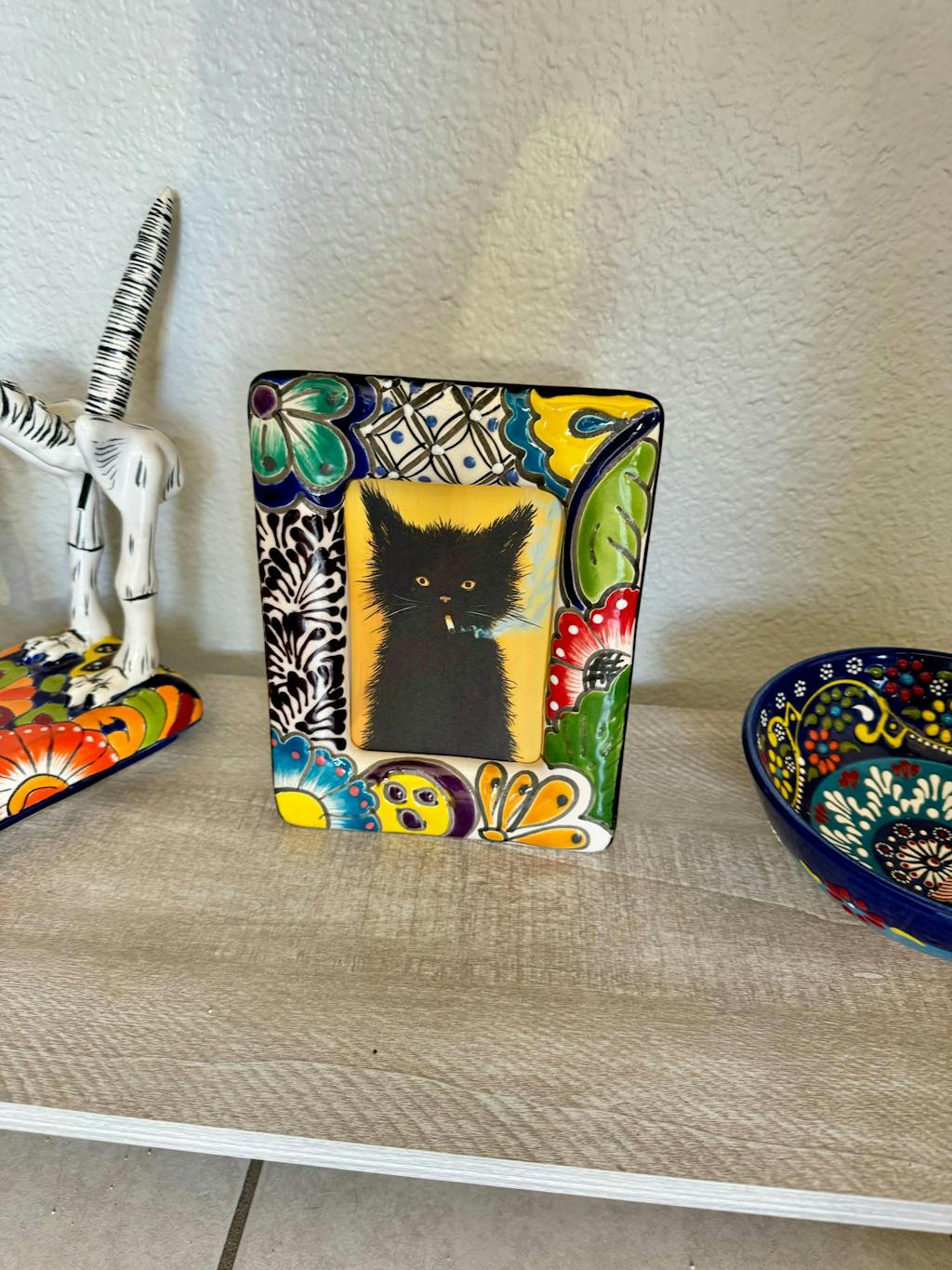 This rectangular ceramic frame features a vibrant multicolor floral border and a cobalt blue rim. Its traditional Talavera design adds a cheerful, artisanal touch to shelves, desks, or walls.