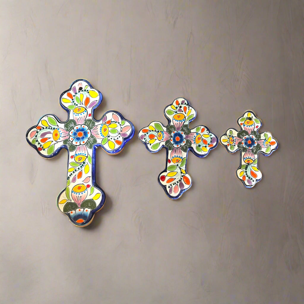 Add color and tradition to your space with this set of three handcrafted Talavera wall crosses. Designed by The Talavera Hub and handcrafted at our family partner workshop in Guanajuato, Mexico. This set of three pieces features hand-painted artistry and is kiln-fired with a lead-free glaze.
