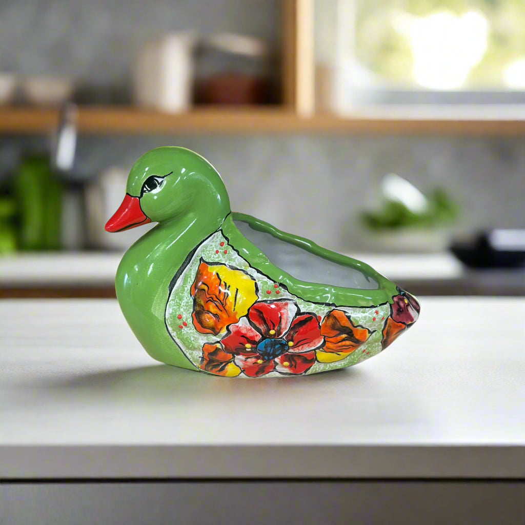 Welcome to our charming collection of hand-painted Talavera Duck Planters! Designed by The Talavera Hub and crafted by hand at our family partner workshop in Guanajuato, Mexico. This piece is hand-painted and kiln-fired with a lead-free glaze. Transform your home or garden with these delightful succulent pottery artworks, sure to bring joy to any setting.