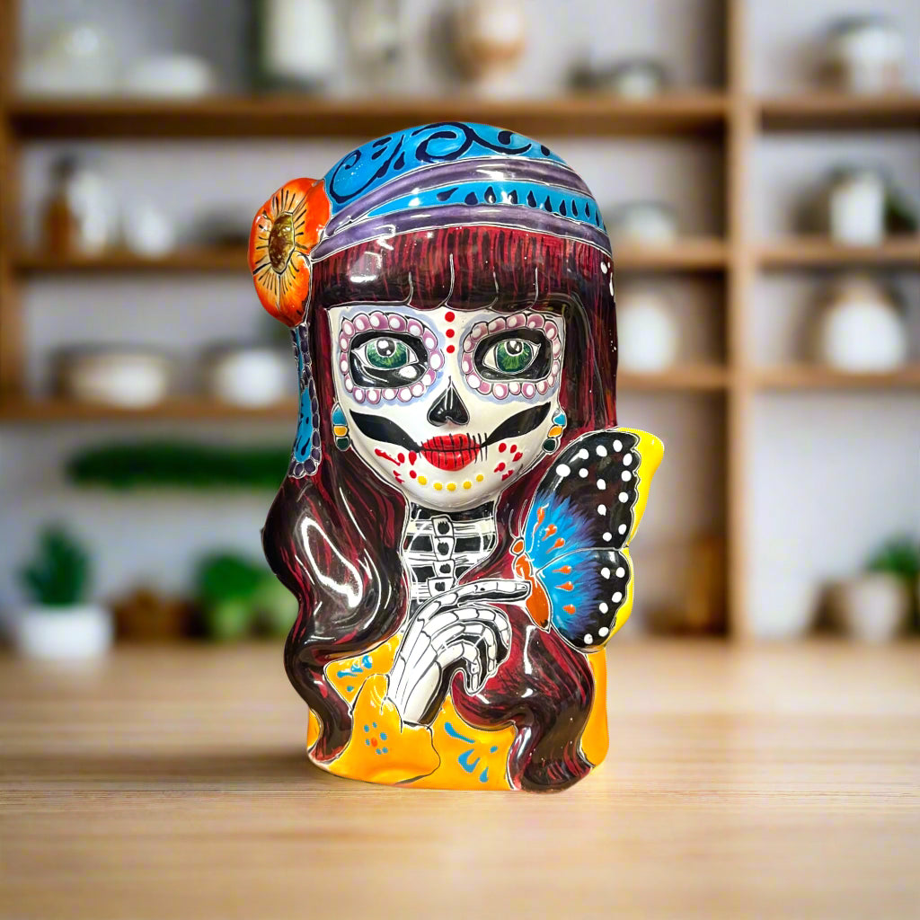 This ceramic pot showcases a beautifully detailed female skull face with green eyes, a bold head wrap, and a vivid butterfly resting on the shoulder. The design captures the spirit of Día de los Muertos—where color, life, and remembrance collide in art. Ideal for use as a small planter or as a standalone decorative piece.