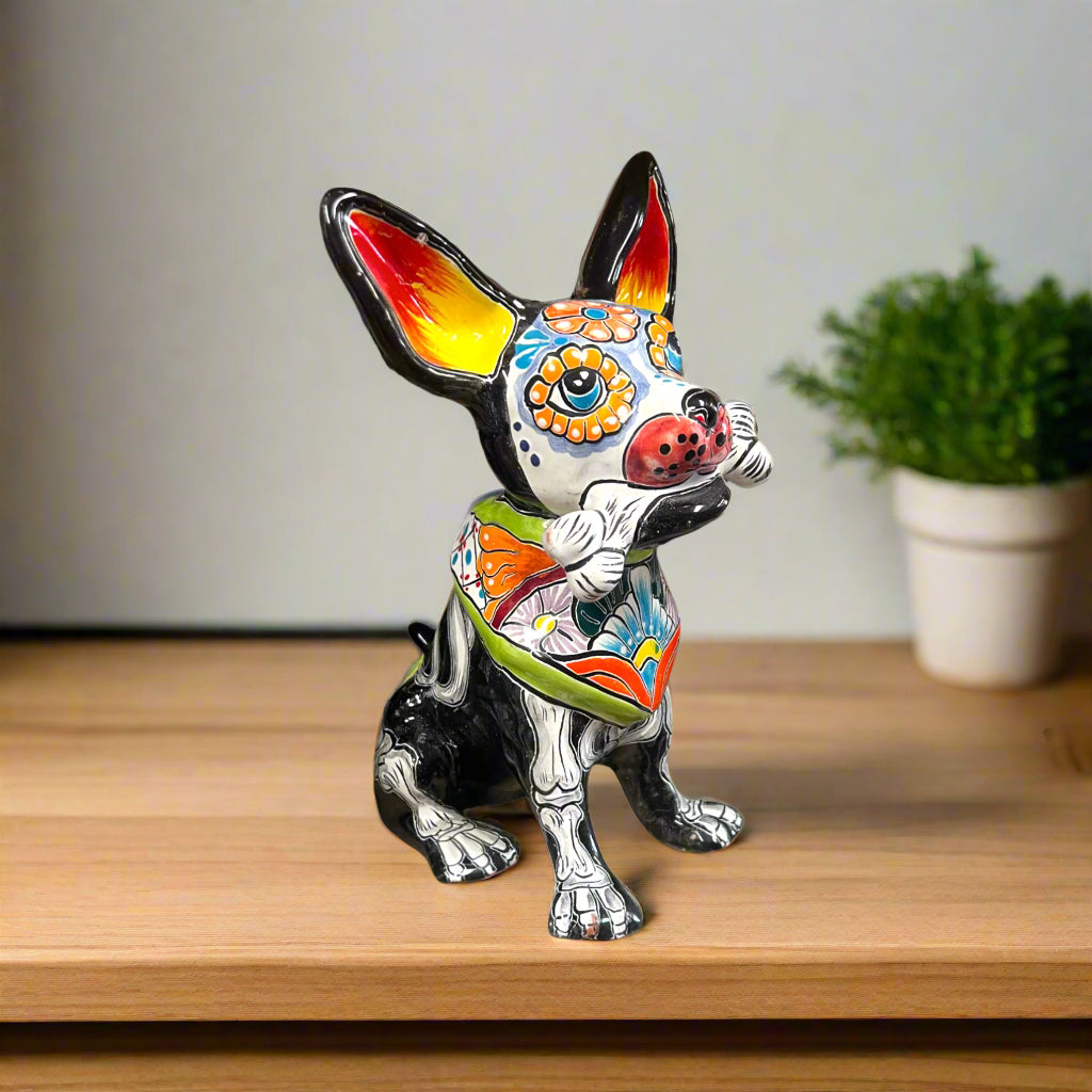 Celebrate vibrant artistry and playful spirit with this handcrafted Talavera Chihuahua statue—featuring a Day of the Dead design and a bone held proudly in its mouth. Designed by The Talavera Hub and crafted by hand at our family partner workshop in Guanajuato, Mexico. This piece is hand-painted and kiln-fired with a lead-free glaze.