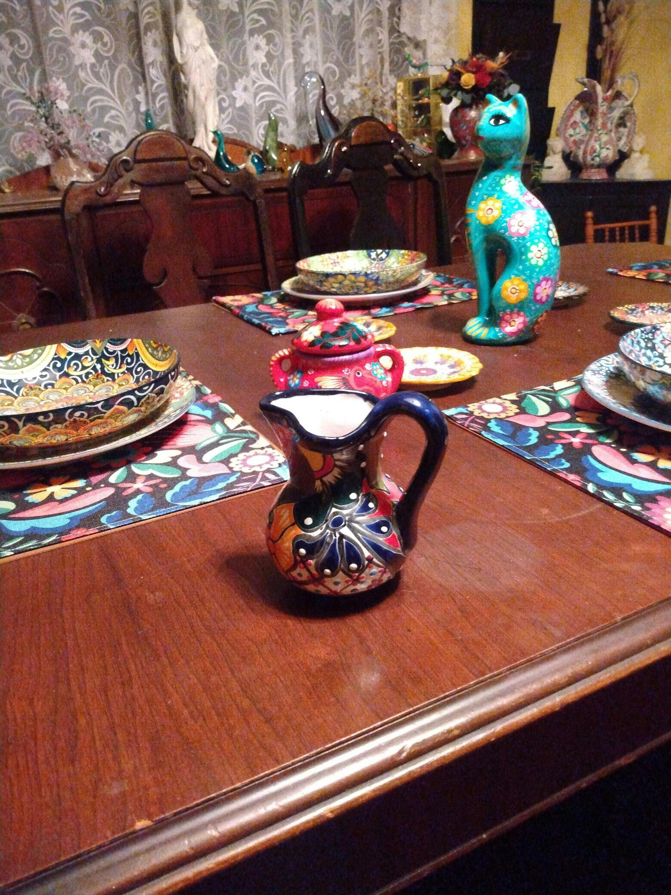 Indulge in the vibrant beauty of this Colorful Talavera Creamer Pitcher, skillfully handmade by Mexican artisans. Designed by The Talavera Hub and handcrafted at our family partner workshop in Guanajuato, Mexico. This piece is hand-painted and kiln-fired with a lead-free glaze. Add a touch of Mexican charm to your home decor with this exquisite piece. Each pitcher is a unique work of art, featuring traditional Talavera craftsmanship. Embrace the warmth and character of handcrafted pottery in your daily life.