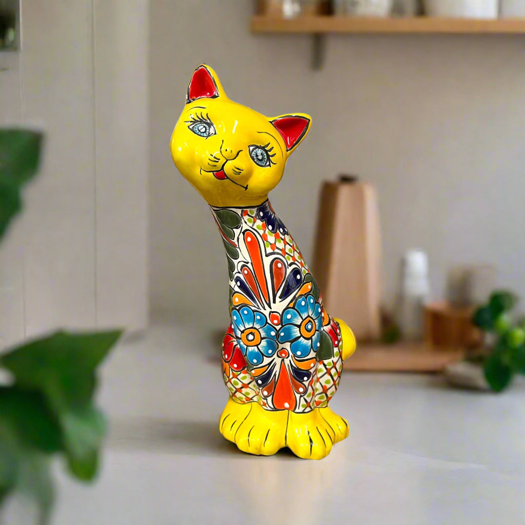 This quirky cat tilts its head with a curious expression, giving off a playful and inquisitive vibe. Decorated in traditional Mexican Talavera motifs with a glossy finish, it's a statement piece for cat lovers and pottery fans alike.