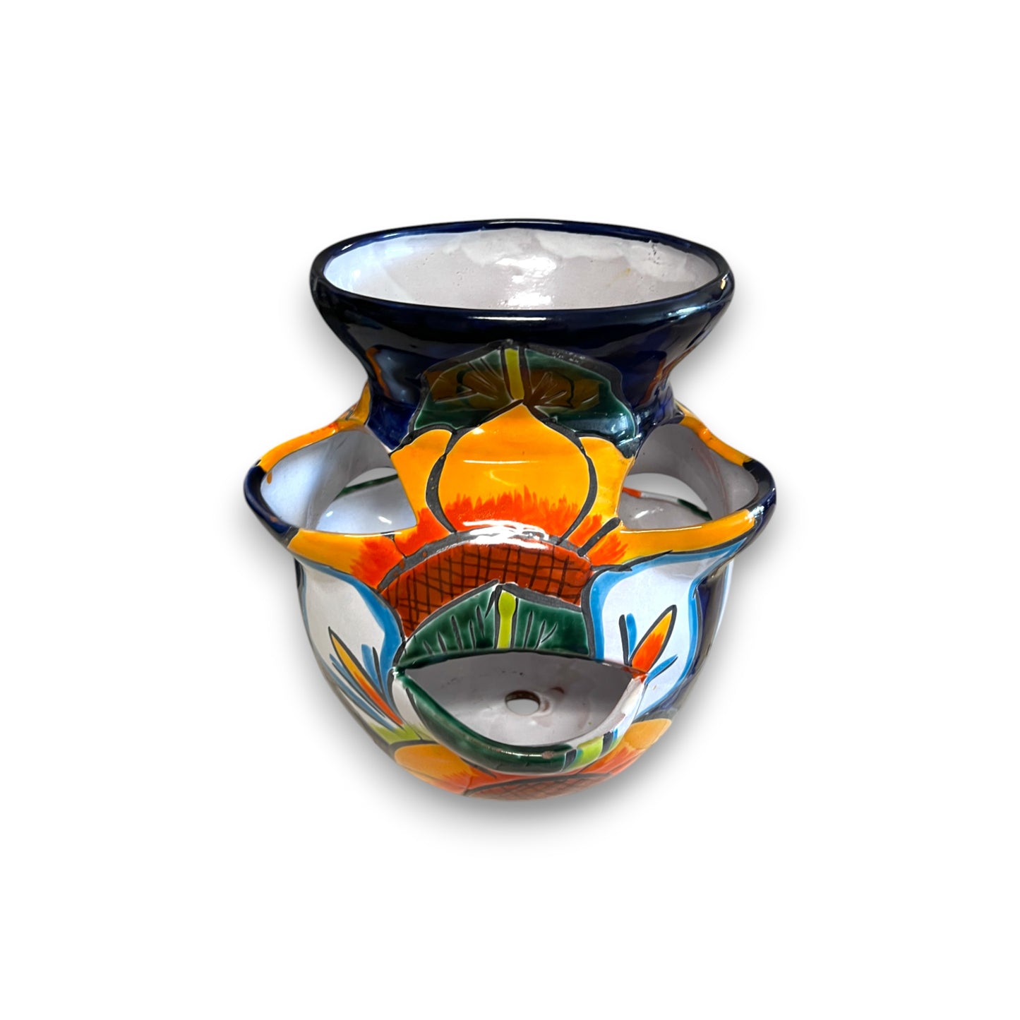 Featuring bold sunflower and lily floral designs in orange, yellow, green, and blue, this piece combines traditional Talavera patterns with a high-gloss finish. The side openings are perfect for planting strawberries, herbs, or cascading blooms.