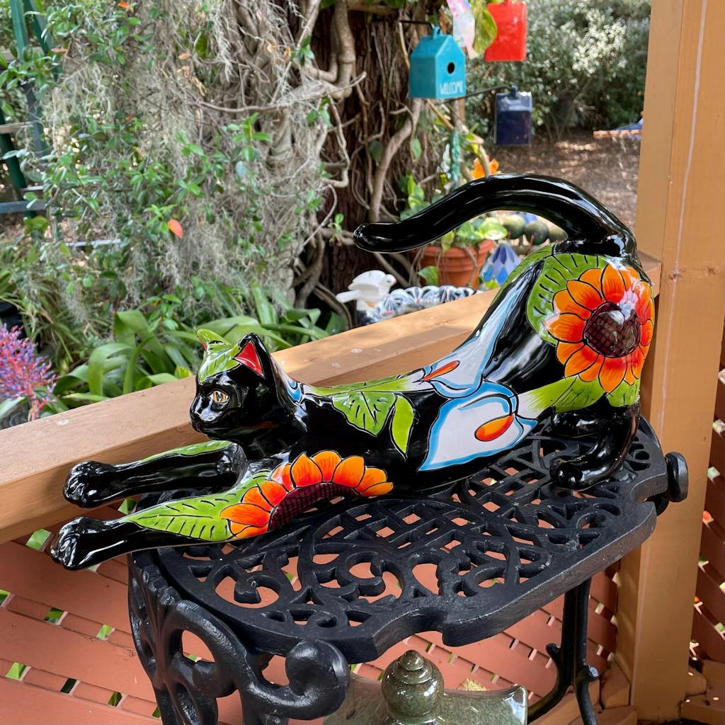This charming Talavera cat features a lively sunflower pattern, making it a standout piece of Mexican folk art.