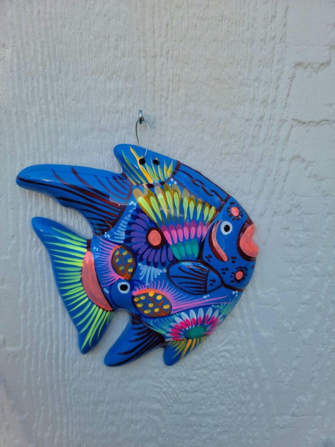 Featuring bold brushstrokes in red, blue, orange, and pink, this playful fish design is brought to life with hand-painted floral and scale motifs. Its whimsical expression and bright palette evoke the spirit of Mexican folk art, perfect for adding personality to your space.