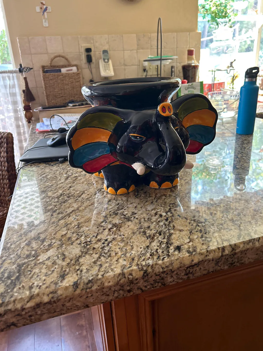 This ceramic planter is shaped like a cheerful elephant and adorned with vivid Talavera patterns. Bold colors like blue, orange, green, and yellow accent its ears, trunk, and body, creating a joyful, eye-catching display.